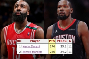 在代表火箭出战的前11场比赛中,杜兰特合计得到276分,超越哈登(266),队史最多。