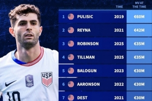 体育资讯11月16日讯 德国转会市场盘点了美国球员历史身价排名,2019年的普利西奇以6000万欧元排名第一。