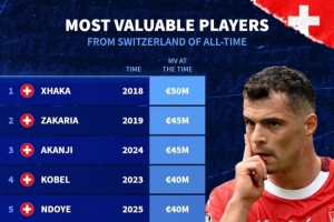 瑞士球员历史最高身价排行:扎卡居首 扎卡里亚、阿坎吉并列第二