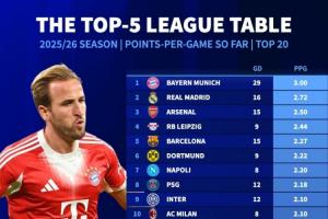 全胜+净胜29球!5大联赛场均积分榜:拜仁3分居首,皇马枪手列2-3